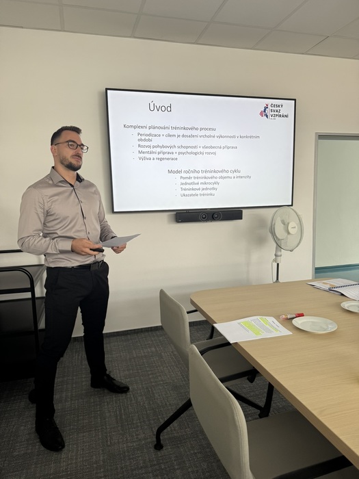 Frekventanti Mgr. Tereza Králová, Ph.D., a Bc. Petr Sedláček prezentovali obsah a závěry svých závěrečných prací a následně odpovídali na dotazy komise. Oba frekventanti u obhajob prospěli a nyní je čeká závěrečná část Trenérské školy – závěrečné zkoušky z obecné části na FTVS v Praze na podzim 2025.